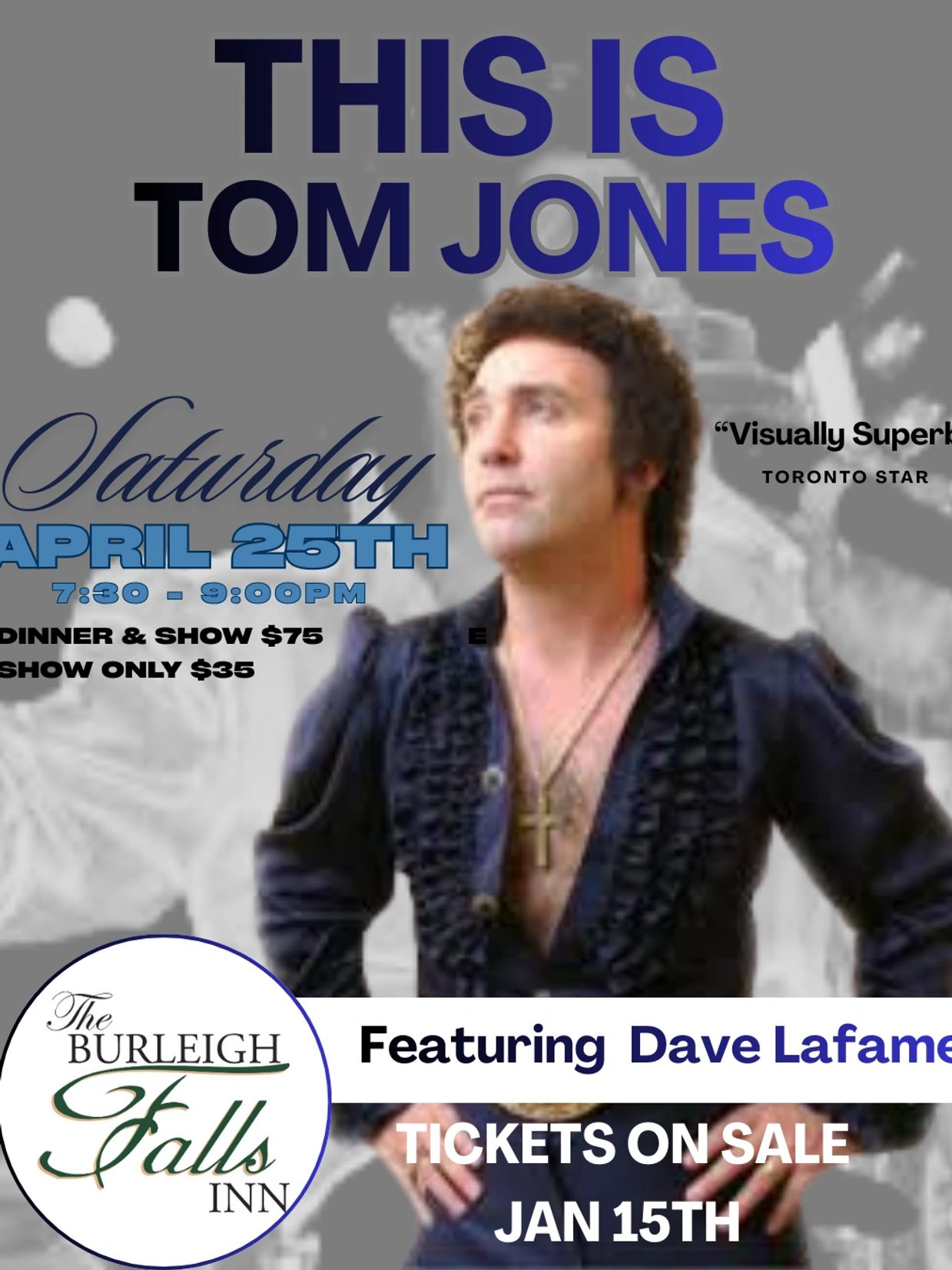 From the initial notes of his opening set to the final bow to his adoring audience, Dave LaFame’s Tom Jones tribute show captures perfectly the glamour, excitement and sizzle of one of the entertainment industry’s brightest stars. Dave LaFame began his career in entertainment more than three decades ago, playing bass guitar and singing with numerous bands in London, England. From there he surged into a successful career onstage, moved to Canada and eventually built up a successful career as an actor, singer and bass player. He amassed numerous credits on television, in film and on stage, and along the way developed a sterling reputation as a hard worker and a team player. In the year 2000, Dave produced a one-man show featuring comedic impersonations of more than 200 musical stars, from Frank Sinatra and Elvis to Freddie Mercury and all three Bee Gees. Although the show was well received from start to finish, it was the rave reviews he received for his impersonation of Tom Jones that led him to expand it into a stand-alone tribute show.